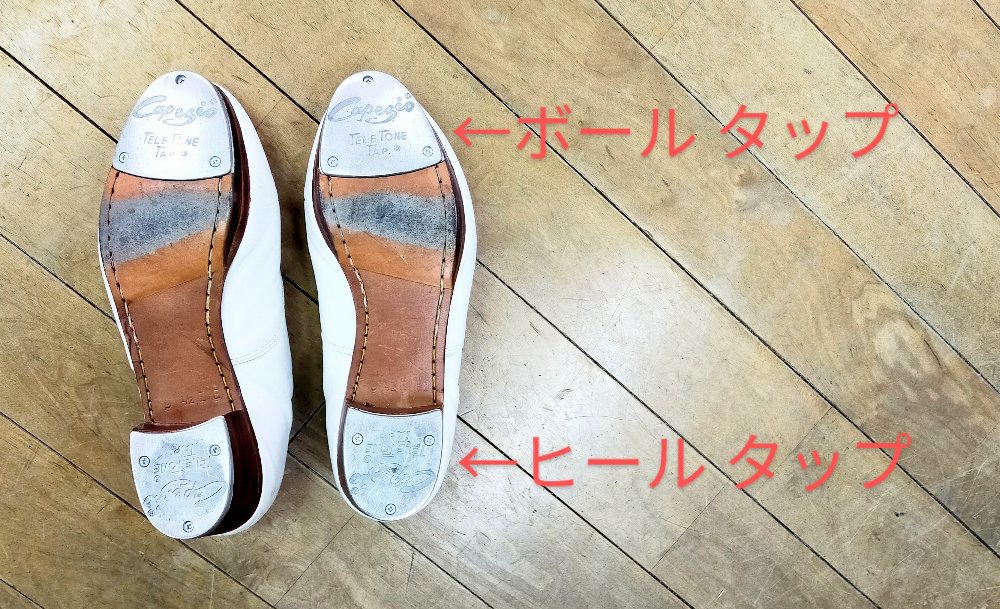 タップシューズは、つま先とかかとにタップスというアルミニウム合金の金具を取り付けた靴です。ボールは、足の親指の付け根の丸いふくらみを指します。なお、金具のことをタップチップというのは和製英語なのでネイティブは言いません。