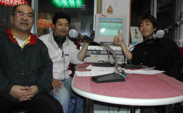 真栄城さん(中央)と瑞慶山さん(右)が熱くDJをしている沖縄のFMラジオ番組「ぢゃんぢゃんバリバリ ★ヤラNIGHT」に出演。3人でストンプ演奏もやっちゃいました。毎週金曜日21時~24時生放送。ネット配信してるので、全国にリスナーがいます。番組放送中にストンプの感想メールが来ました。