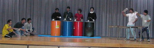 東京への出張おつかれさまです。今日、ストンプのメニューについて皆で考えてみました。やはり、ビデオなど、参考になる物を見てみないと何とも言えない状況です。ブーツダンス・オブ・ファイヤーマン、ドラム缶ドラムスは外せないと思います。フライングデスクも是非やってみたいのですが、それに使用する机がまだ手配できていません。知り合いの教育委員会の人間や、学校の事務の方に調べてもらってます。あと、班にわけていくつかのメニューをしてみたいってのもあるんですが、最後は全員でってのがありまして、ストンプメニューをパート分けしてチャンプルー(沖縄の方言で混ぜる、アンサンブル(?)って意味