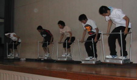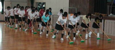 全員デッキブラシですか…34人が同時にというのはムツカシイですね。やるならバスケのコートほどの広さが必要です。講堂のステージなら10人程度の3グループでそれぞれ演じて、最後にむりやり全員を出して終わりという感じでしょうか。それでもデッキブラシ34本は必要ということです。たぶん何本かは練習中に壊れるので、最終的には40本くらいになるかもしれません。それと、デッキブラシだけで10分間以上引っ張ると、繰り返しが多くなり作品にメリハリがなくなります。デッキブラシだけなら4、5分がいいとこです。提案ですが、掛け声、足踏み、手拍子、長グツダンスのうちどれかを組み合わせればバリエーションも広がります。どうですか?過去の発表の様子のビデオを送りますので、参考にしてください。それから、フライングデスクもいれておきますので再度検討してください。男子生徒にはオススメです。デッキブラシについては、そちらに行ってから直に指導します。参考までに試験期間はいつですか?